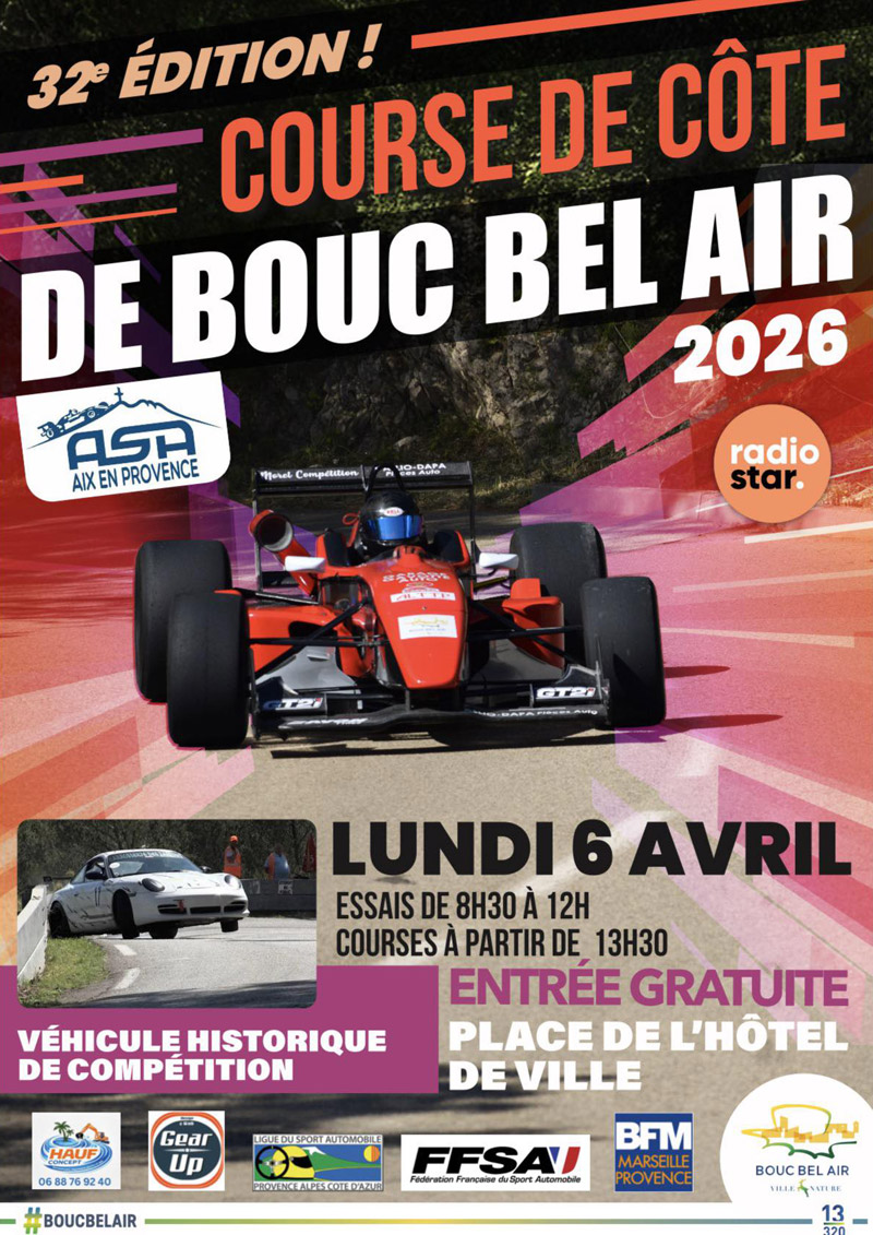 32e Course de Côte régionale de Bouc-Bel-Air, organisée les 5 et 6 avril 2026 par l’ASA Aix-en-Provence, ligue Provence Alpes – Côte d’Azur.