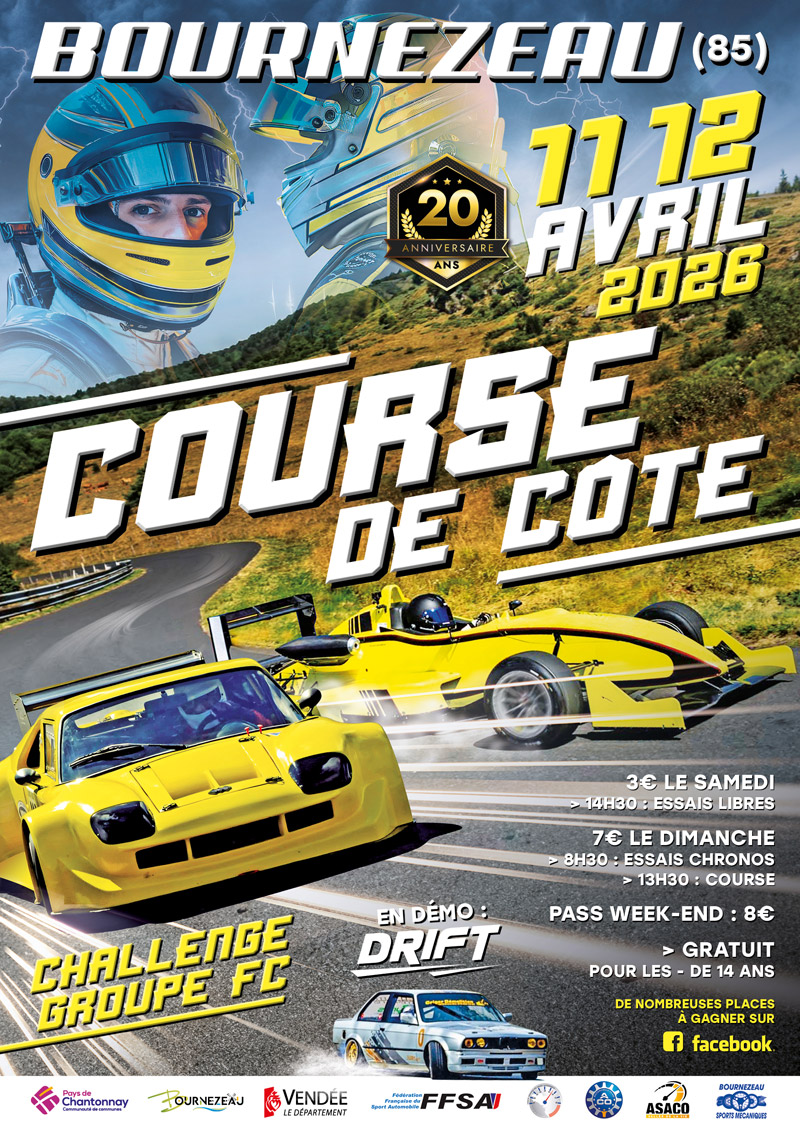 20e Course de Côte régionale de Bournezeau, organisée les 11 et 12 avril 2026 par l’ASACO Vallée de la Vie et l’Écurie Bournezeau Sport Mécanique, ligue Bretagne – Pays de la Loire.