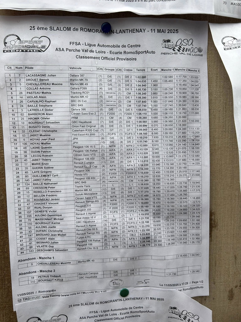 Classement complet du 25e Slalom régional de Romorantin-Lanthenay.