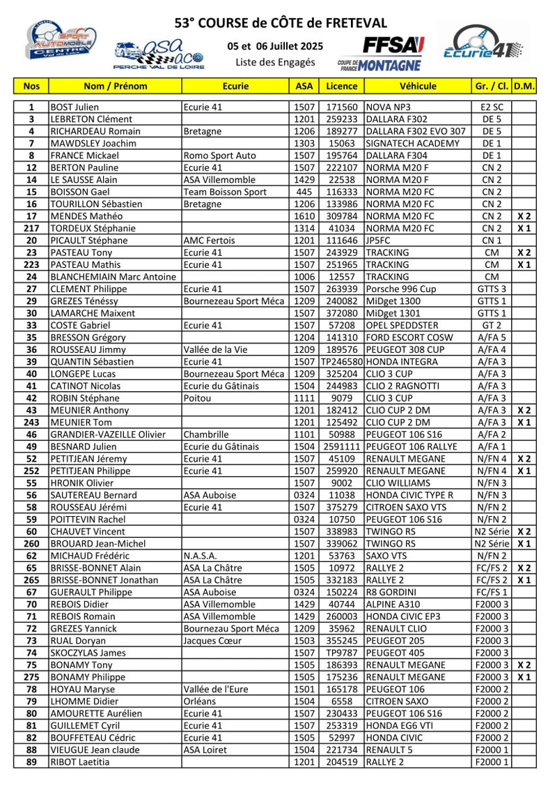 Liste numérotée des engagés à la 53e Course de Côte régionale de Fréteval.
