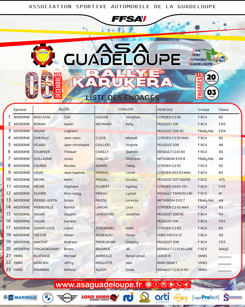 Liste numérotée des engagés au 6e Rallye régional Karukéra.