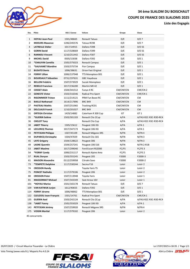 Liste numérotée des engagés au 34e Slalom régional du Boischaut.