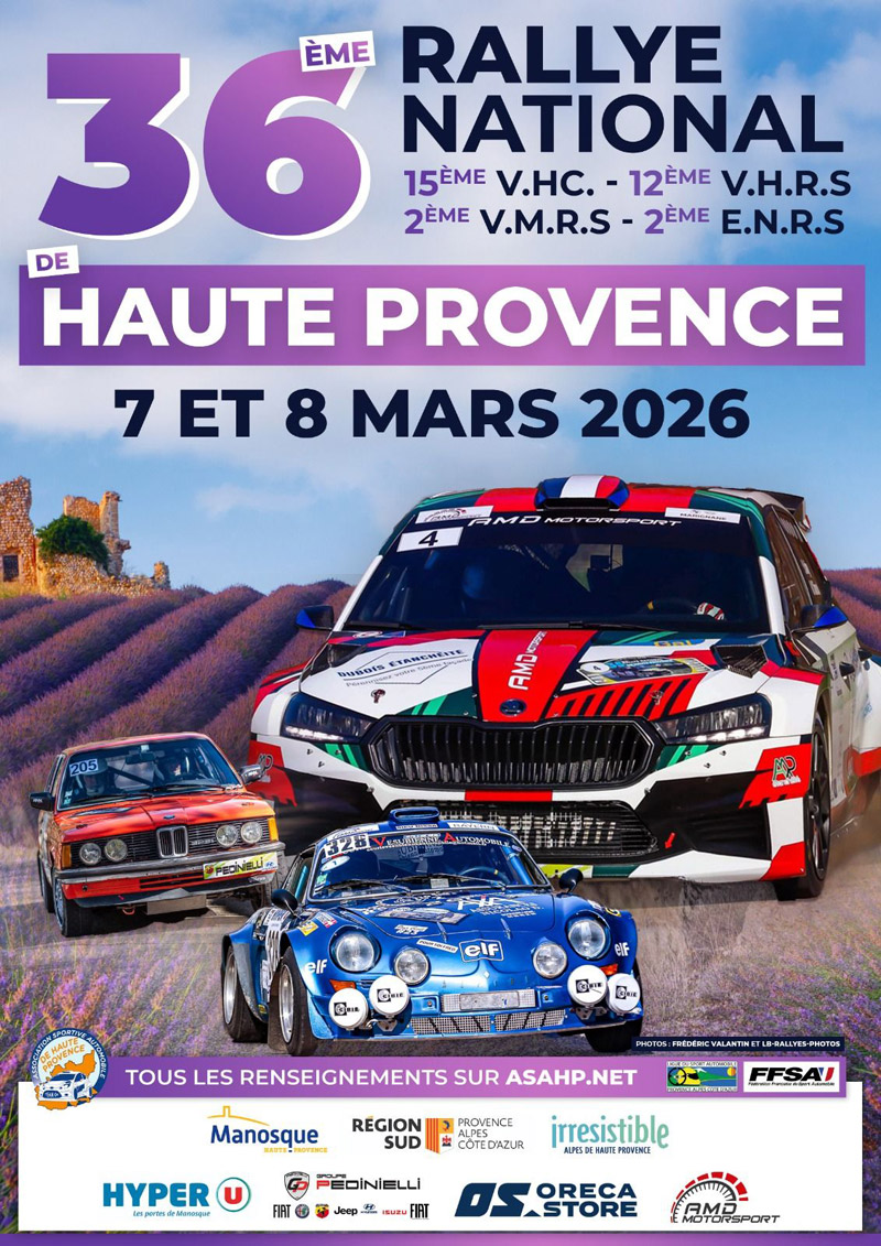 36e Rallye national de Haute Provence & VHC VHRS VMRS ENRS, organisé les 7 et 8 mars 2026 par l’ASA de Haute Provence, ligue Provence Alpes – Côte d’Azur.